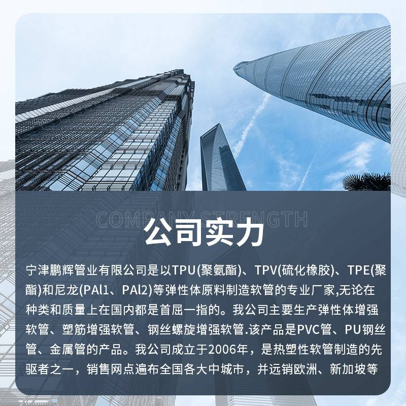 宁津鹏辉管业有限公司是以TPU(聚氨酯)、TPV(硫化橡胶)、TPE(聚酯)和尼龙(PAl1、PAl2)等弹性体原料制造软管的专业厂家,无论在种类和质量上在国内都是首屈一指的。我公司主要生产弹性体增强软管、塑筋增强软管、钢丝螺旋增强软管.该产品是PVC管、PU钢丝管、金属管的产品。我公司成立于200......