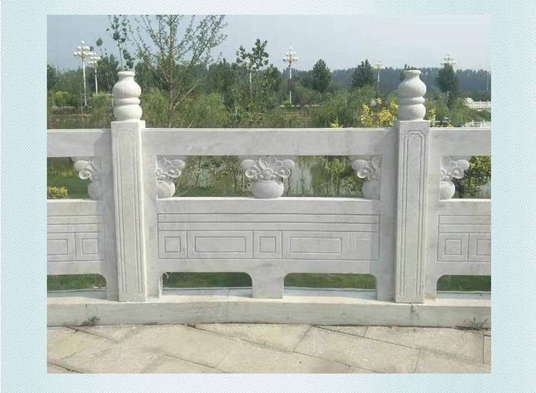 石栏杆主要起分隔空间、安全防护的作用,还用于划分活动范围及组织人流,同时又可装饰环境,丰富空间。栏杆一般设于草地、花坛的边缘,阻止行人进入;或设于水边、崖畔等危险之处,避免行人跌落。但是,景观石栏杆在绿地中不宜普遍设置,特别是在浅水边、小平桥、小路两侧,能不设置的尽量不设置;在必需设置石材栏杆的地方,应把围护、分隔的作用与美化、装饰的功能有机地结合起来。护栏在危险处起到保护人的作用,而有些景点、景物本身十分珍贵,具有***价值和意义,此时石栏杆将起到保护景物的作用。