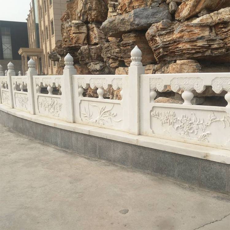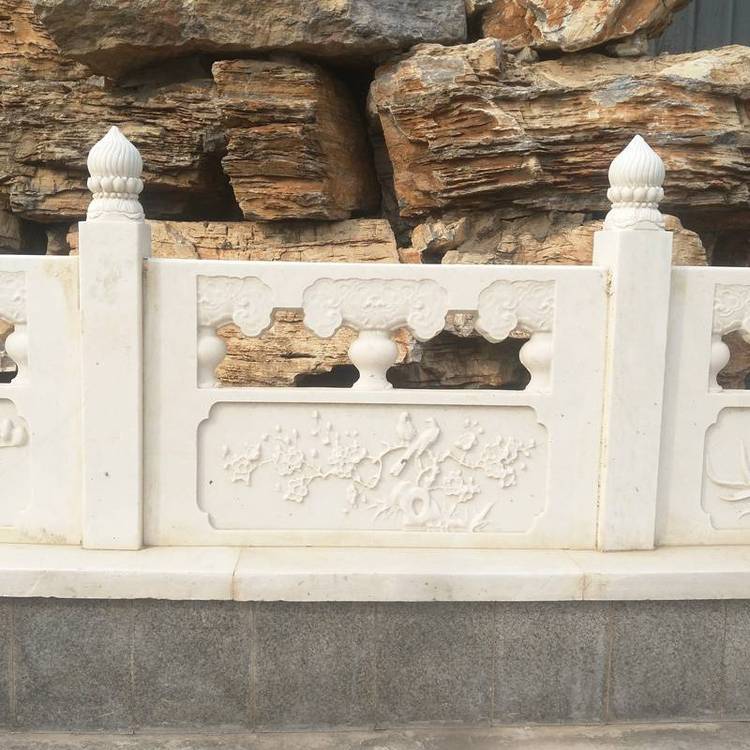 下图大理石栏杆采用对称式构图将石栏板浮雕一分为二,画面稳定、平衡,具有装饰性,如果不加上喜鹊等小鸟,就显得单调、呆板,缺少趣味性,加上小鸟后就生机勃勃,对称式构图在梅兰竹菊题材的雕刻创作中属于不够讨喜的构图形式。