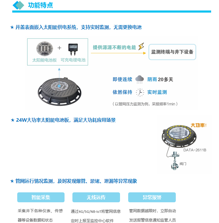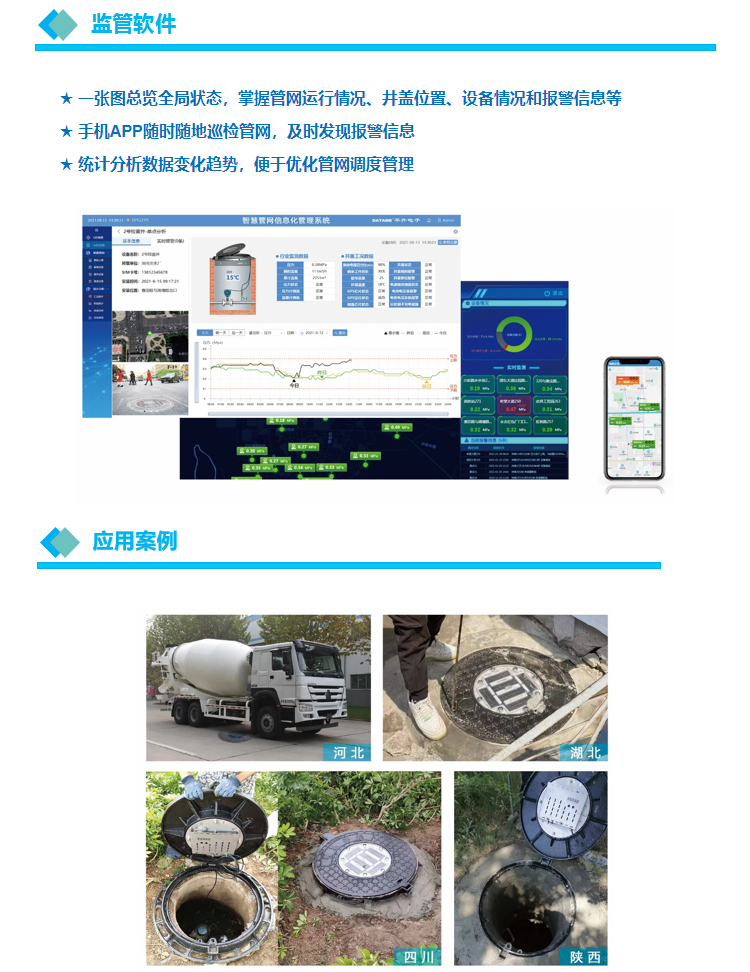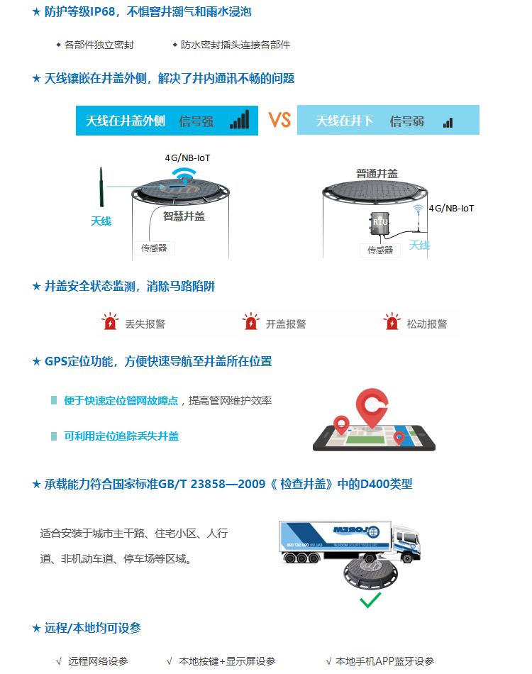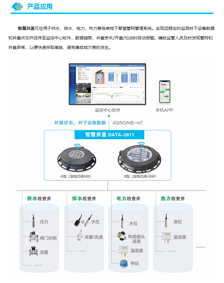 平升电子智能井盖监测终端 太阳能供电智慧井盖 智慧城市窨井水位监测设备,实现对井下设备和井盖状态的监测及预警,是各类智慧管网管理系统中不可或缺的重要设备,解决了井下监测环境潮湿易水淹、电力供应困难、通讯不畅等难题, 适合安装于城市主干路、住宅小区、人行道、非机动车道、停车场等区域的窨井。