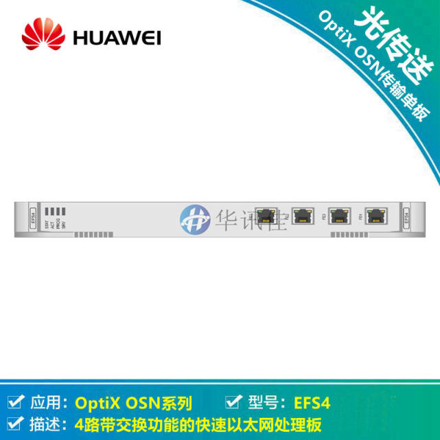 华为OSN3500、OptiX OSN2500、OSN1500 SSN3EFS4单板的功能和特性。华为EFS4单板是4路带交换功能的快速以太网处理板,接入4路FE以太网信号,处理4路FE业务。采用面板直接出线。支持二层交换、MPLS、组播等功能和特性。