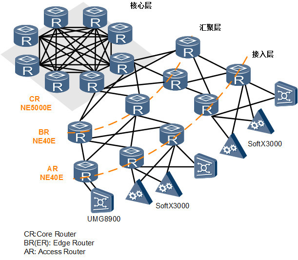 核心层采用双平面结构,核心设备NE5000E之间采用full-mesh全连接;