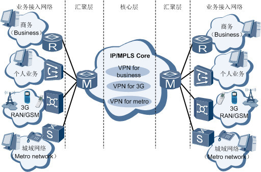 基于ME60-X3,可以将各种业务网络接入IP/MPLS核心网,并在核心网中通过MPLS ***,将来自各类业务网的业务相互隔离,保证业务的安全和QoS。