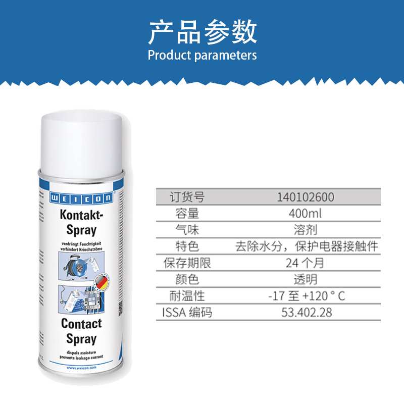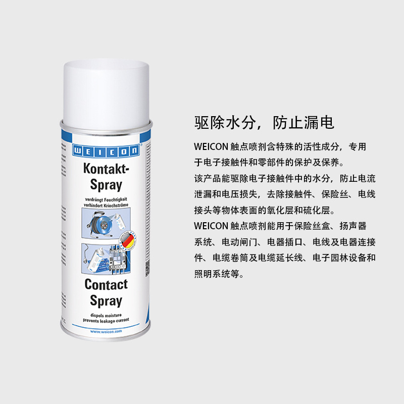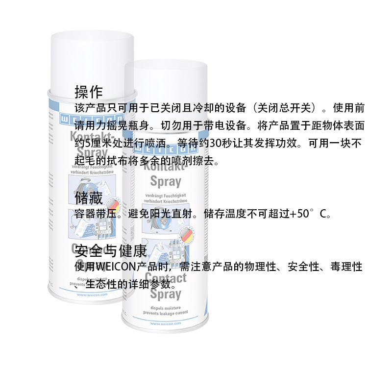 ·WEICON 触点喷剂能用于***丝盒、扬声器系统、电动闸门、电器插口、电线及电器连接件、电缆卷筒及电缆延长线、电子园林设备和照明系统等。