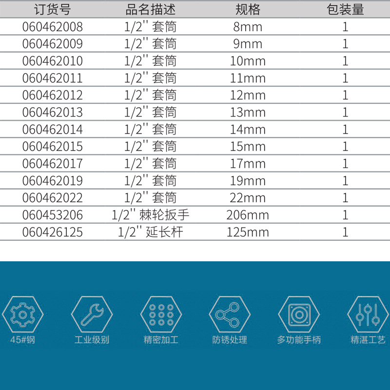 铬钒钢,垫镀铬,带塑料嵌入件的金属盒包装,四方套筒1/2寸规格:8-22mm。