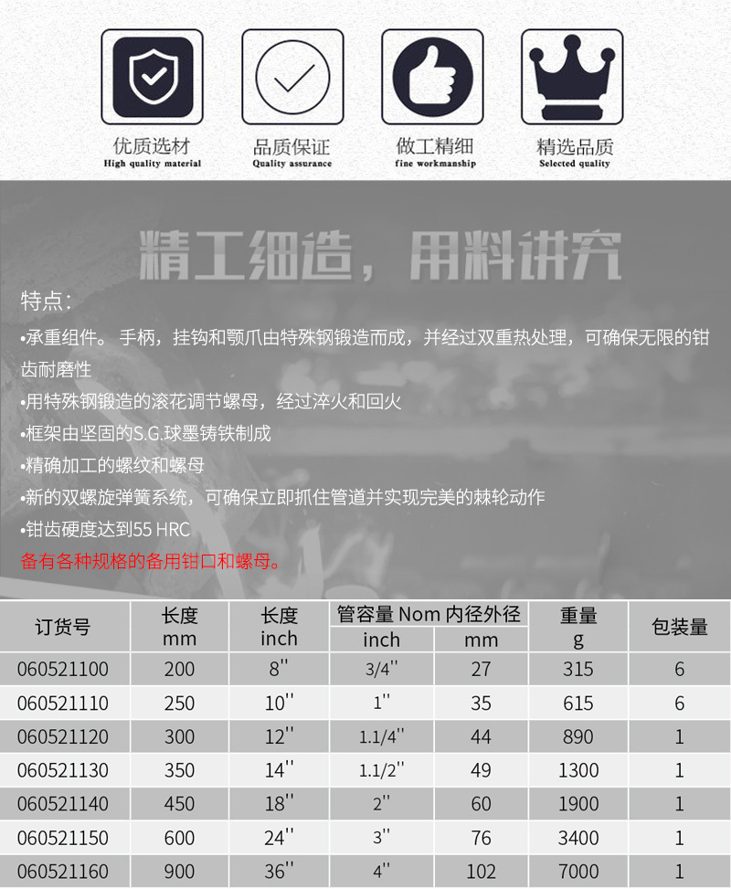 •承载部件。 手柄,钩子和下颚由特殊钢锻造而成采用双重热处理,确保钳齿无限制的耐磨性