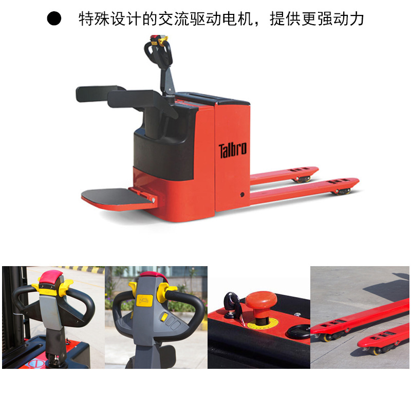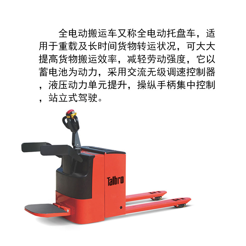 ·全电动搬运车又称全电动托盘车,适用于重载及长时间货物转运状况,可大大提高货物搬运效率,减轻劳动强度,它以蓄电池为动力,采用交流无级调速控制器,液压动力单元提升,操纵手柄集中控制,站立式驾驶