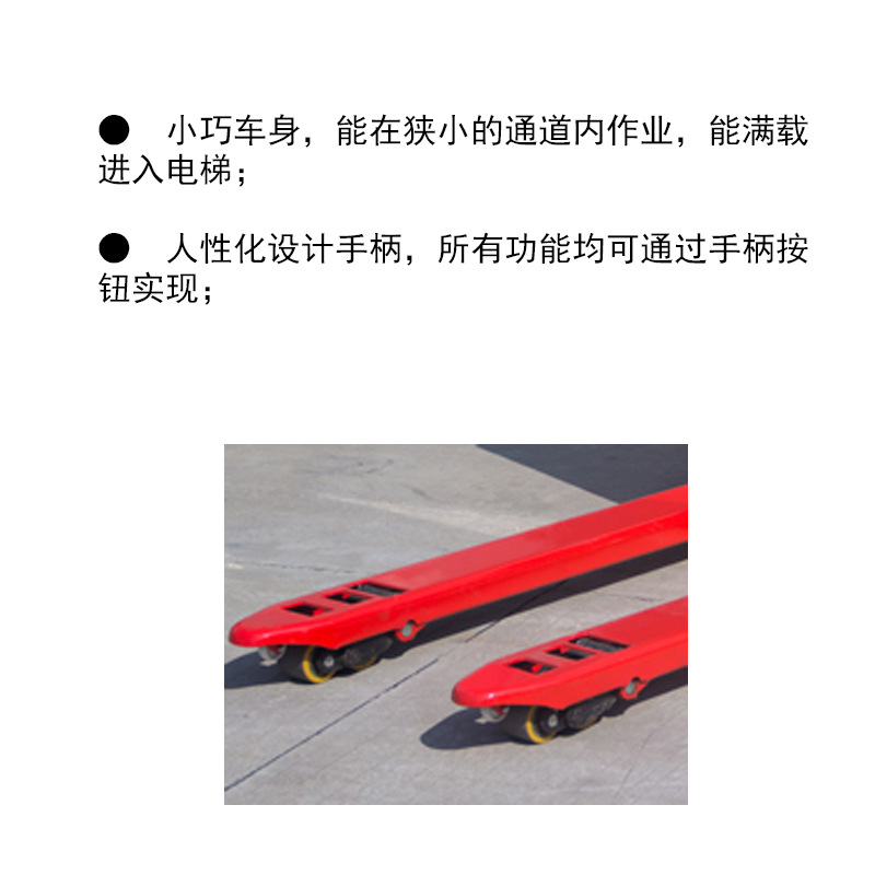 ·小巧车身,能在狭小的通道内作业,能满载进入电梯