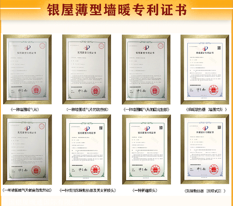 银屋暖通国际的研发团队经过多年的潜心研究,在银屋薄型散热器片的散热片结构、安装方式、连接配件等方面先后获得中华人民共和国***知识产权局颁发的8项专利证书。