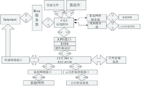 其中,Flash/ROM用于存储家庭网关中的嵌入式操作系统、HTTP服务器、CGI网关程序、家庭网络服务器以及各种服务所需的文件系统。整个家庭网关软件平台存储在Flash中,系统启动时,将从Flash中运行引导程序,解压操作系统并将其移入SDRAM中。