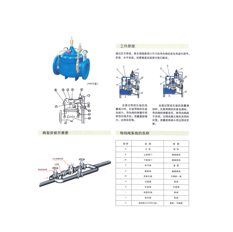 400X流量控制阀由主阀、流量调节阀、针阀、导阀、球阀、微形过滤器和压力表组成水力控制接管系统。利用水力自动操作,控制和调节主阀开度,使通过主阀的流量保持不变。