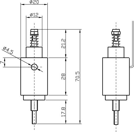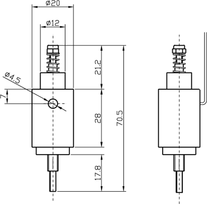 直动式电磁铁属微型电磁铁。通电状态时推杆伸出;在失电状态时,推杆在弹簧力作用下自动复位。该电磁铁具有体积小,响应速度快,动作可靠等特点。