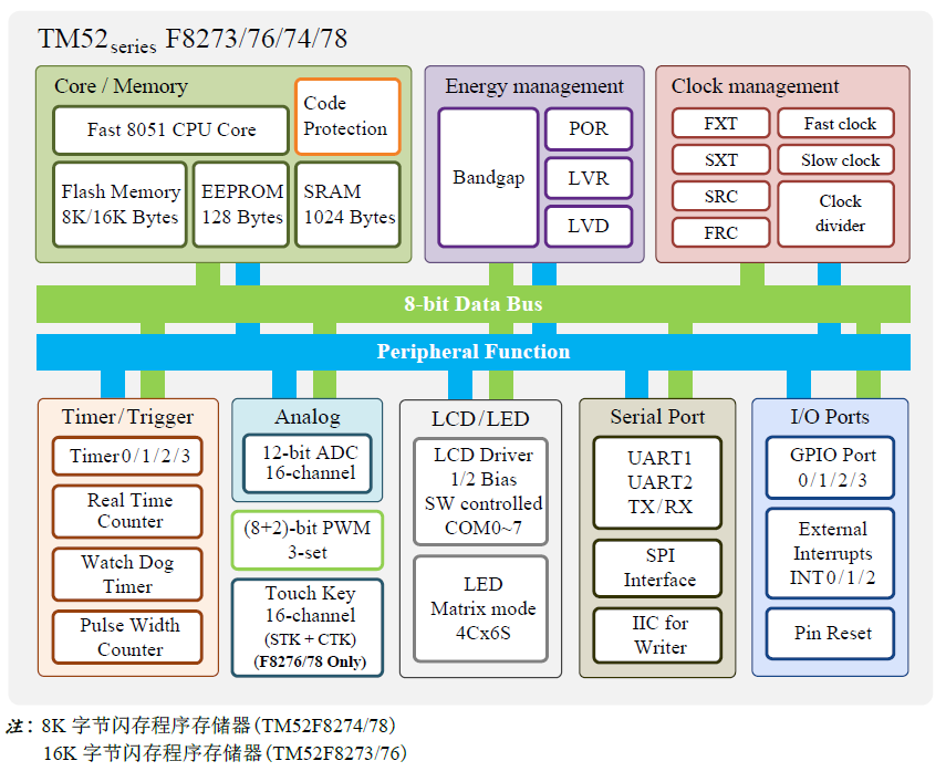 TM52-F8273/76/74/78通过集成多种功能在芯片上,提供更高的性能,更低的成本,能快速进入市场,包括8K/16K字节的闪存(Flash)程序存储器,128字节的EEPROM数据存储器,1024字节SRAM,低电压复位(LVR),低电压检测(LVD),双时钟省电工作模