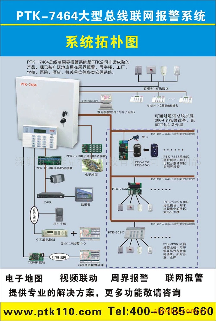 联网功能:可与PTK-7416、PTK-7464等报警主机配合使用