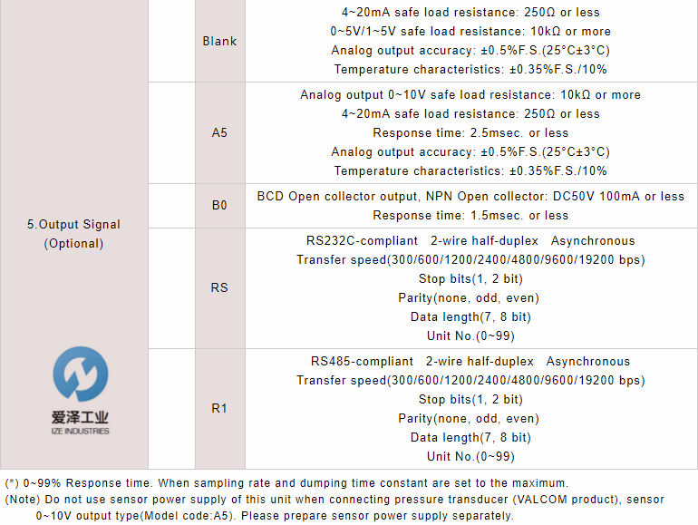 标配的模拟输出范围为4至20 mA,1至5 V和0至5 V.