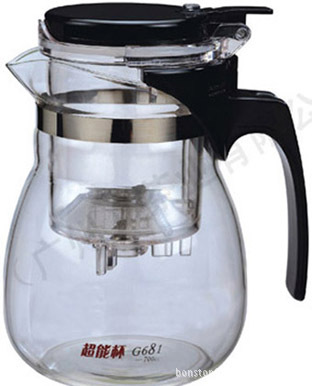 G681邦田超能泡茶杯咖啡杯***玻璃泡茶壶邦田超能壶锦盒套装为茶叶、咖啡冲泡器。其一体式设计使茶与咖啡的冲泡变得更轻松简便。采用100目不锈钢网,即使粉末状咖啡也一样过滤。经过改良的出水按钮,轻按右旋即可松开手指且使内胆长时间保持出水状态,此功能在咖啡的冲泡时尤显重要。内胆的杯口附有密封胶条,其作用在于倾倒外杯内的茶水时内胆茶水不会流出,使得您可以在泡茶的同时倒出外杯内的茶水,从而节省泡茶时间。