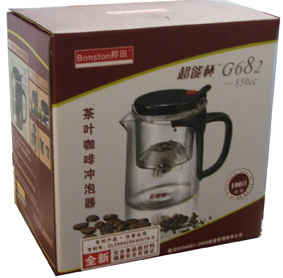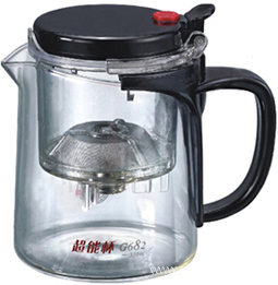 G682超能杯超越杯玻璃泡茶壶飘逸杯泡茶杯茶具一体式冲茶器, 外杯为***烧杯料,直接在火上烧煮,瞬间温差可达150℃,手工玻璃制作,杯身上没有气泡、条纹,透明感强。塑胶部分采用***食品级塑胶,符合FDA要求,***无***,不影响冲泡物的味道; 金属部分采用316#型不锈钢,耐强酸、强咸,保证产品的经久耐用。玻璃外杯耐高温,通透度高且做工精细。 优点价绍:a.使用简便,可冲泡各种茶叶、饮品;b.可依个人喜好控制茶水浓淡;C.100目不锈钢滤网,***过滤,即使茶粉都可泡出清醇的茶水;d.泡出的茶水量多,可供多人饮用;e.使用食品级材料,可放心使用;f.使用环境:如居家办公,出差旅行、洒楼、会所等等