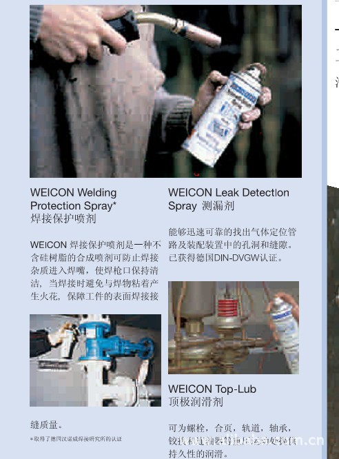 Weicon焊接保护喷剂是一种不含硅树脂的合成喷剂,可以防止焊接杂质进入焊嘴,使焊枪口保持清洁,当焊接时避免与焊接物粘着产生火花,保障工作的表面焊接接缝质量。