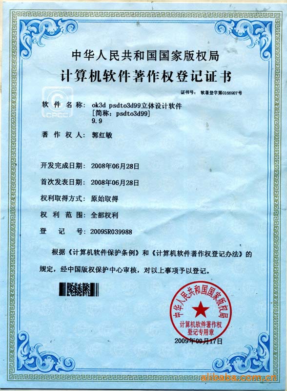 第二,psdto3d99立体软件已经在中国版权局注册登记(注册登记号为2009SR039988)。