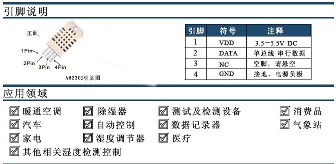 AM2302数字温湿度传感器是一款含有已校准数字信号输出的温湿度复合传感器。它应用专用的数字模块采集技术和温湿度传感技术,确保产品具有极高的可靠性与卓越的长期稳定性。传感器包括一个电容式感湿元件和一个NTC测温元件,并与一个高性能8位单片机相连接。因此该产品具有品质卓越、超快响应、抗干扰能力强、性价比极高等优点。每个AM2302传感器都在极为精确的湿度校验室中进行校准。校准系数以程序的形式储存在OTP内存中,传感器内部在检测信号的处理过程中要调用这些校准系数。单线制串行接口,使系统集成变得简易快捷。超小的体积、极低的功耗,信号传输距离可达20米以上,使其成为各类应用甚至最为苛刻的应用场合的最佳选则。产品为4针单排引脚封装。连接方便,特殊封装形式可根据用户需求而提供。