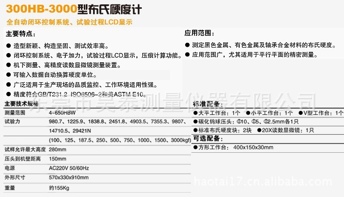 谁能提供300HB-3000布氏硬度计生产供应商电话?布氏硬度计300HB-3000生产供应商电话是多少呢?在广东东莞有一家昊泰测量仪器有限公司生产销售300HB-3000,HR-150DT电动洛氏硬度计等各类硬度计如:洛氏硬度计、表面洛氏硬度计、数显洛氏硬度计、维氏硬度计、韦伯硬度计、里氏硬度计、布洛维硬度计等.并与国内多家硬度计厂家签订合作协议,昊泰公司成为上海、山东等硬度计厂家在深圳、东莞、中山等周边城市硬度计的***点。我们可以为您维修洛氏硬度计,维修维氏硬度计,维修三丰量具,维修三丰硬度计等多种产品,公司技术人员业务技能高超。可以随时***为您排优解难!