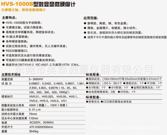 东莞哪里有HVS-1000B数显显微硬度计生产制造商?数显显微硬度计HVS-1000B生产制造商在哪呢?在广东东莞有一家昊泰测量仪器有限公司是HVS-1000B数显显微硬度计,HSRS-45数显洛氏硬度计生产制造商,生产销售维氏硬度计,巴氏硬度计等各类硬度计如:国产洛氏硬度计、表面洛氏硬度计、数显洛氏硬度计、维氏硬度计、韦伯硬度计、里氏硬度计、布洛维硬度计等.并与国内多家硬度计厂家签订合作协议,昊泰公司成为上海、山东等硬度计厂家在深圳、东莞、中山等周边城市硬度计的***点。我们可以为您维修洛氏硬度计,维修维氏硬度计,维修三丰量具,维修三丰硬度计等多种产品,公司技术人员业务技能高超。可以随时***为您排优解难!