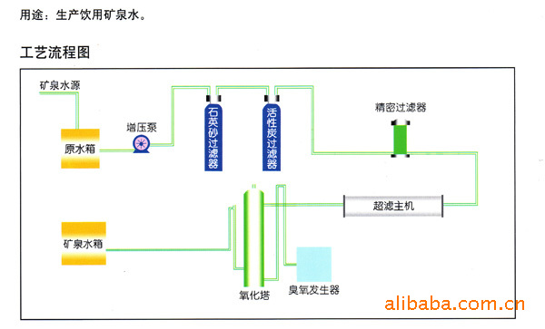 源水箱→→源水泵→→精砂过滤器→→活性炭吸附器→→精密过滤器→→超滤装置→→紫外线杀菌器