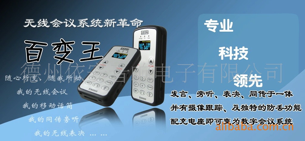 EN-9900是由依安音响电子有限公司推出的无线会议系统产品,其采用经济实用的无线同传旁听单元,***辐射范围广,CD音质,保密性好,安装及其方便,使用时间长。产品采用流线型设计,美观流畅,轻便小巧,同时还集成了无线发言、无线收听、无线同传、无线表决功能,具有MIC输入、LINE输入、耳机输出、USB接口功能。产品可做无线表决器使用,有赞成、反对、弃权和5键评分等功能,并在屏幕上实时回传表决结果;会议上发言实用,接上咪头,按下发言键即可发言,同时可传输立体声音频输入信号,***单元可控制其发言,并有摄像跟踪功能,关闭发言键,自动转为接收状态,能选择多达19个频道的高保真立体声信号,可做音乐***、流动会议等。EN-9900的彩色屏幕及其中英文显示使信息一目了然,方便简洁;可胸挂、可桌面放置、可手持流动,更具有百变的功能,放在充电座上面,即可像iphone一样,自动将话筒和喇叭转接到底座上,变成无线桌面会议系统。其独特的防丢功能,避免租赁行业经常丢失的问题,一走出使用区域即可报警。产品可与依安公司其他型号的数字话筒通用,如手持、领夹、导游、台式发射机、同传、会议、无线音箱等,是一款非常方便实用的无线会议产品