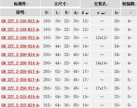 - K型:焊接轮毂、标准H9铰制通孔和键槽,符合DIN 6885/1 P9规定的公差。