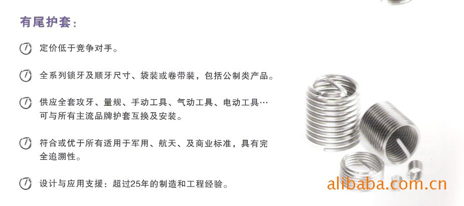 根据NA***122076和NA***124651系列(标准螺纹)以及NA***21209(锁牙螺纹)所述,无尾护套专为取代有尾护套而设计;护套可根据NA***33537要求安装在STI标准螺纹孔中,安装好的护套可提供符合FED-STD-H28/2要求的精致螺纹,并支持标准螺钉、螺丝(MIL-S-7742)或UNJ(MIL-S-8879)的使用。