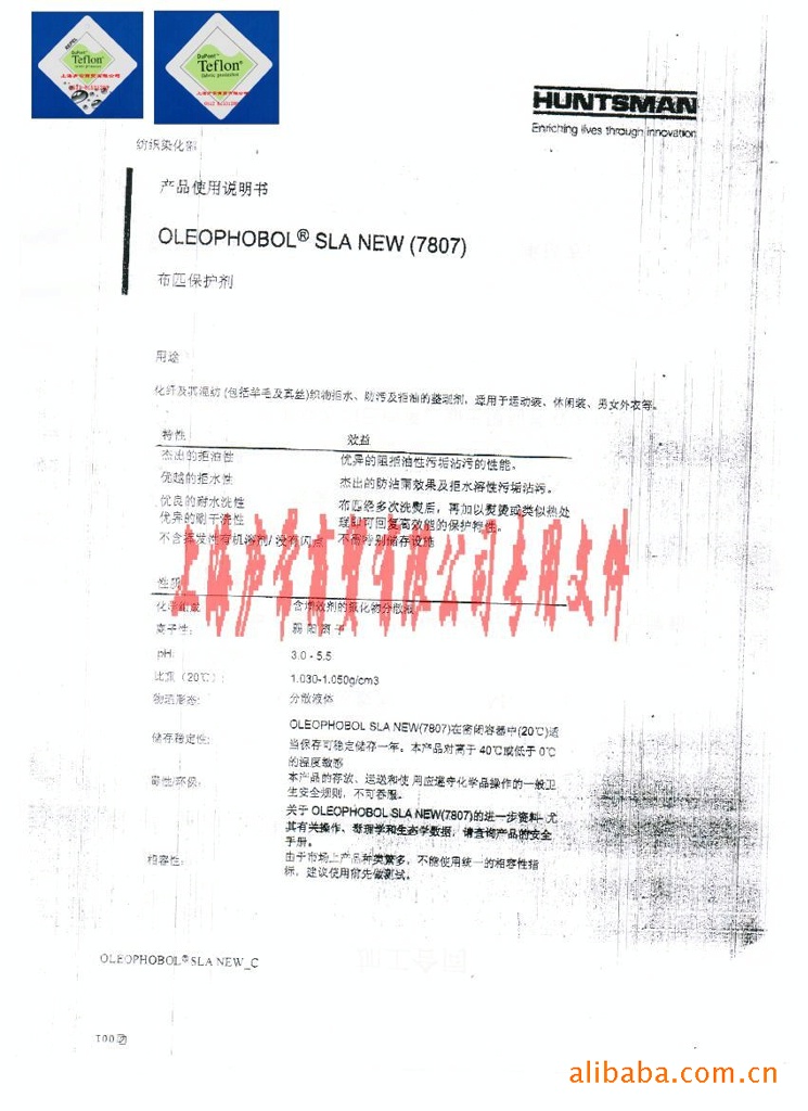 储存稳定性: OLEOPHOBOL SLA NEW(7807)在密闭容器中(20℃)适当保存可稳定储存一年。本产品对高于40℃或低于0℃的温度敏感