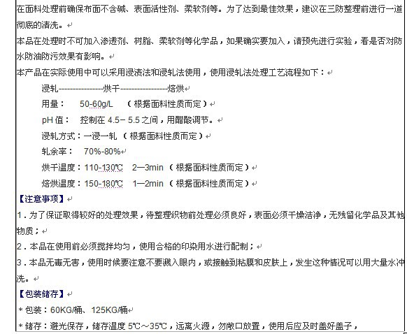 功能 | 三防 | 应用范围 | 面料的防水防油防污整理 |