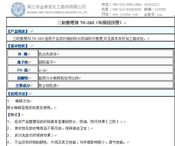 地址:主营产品:三防整理剂,防水防油剂,吸湿排汗整理剂,抗紫外线剂