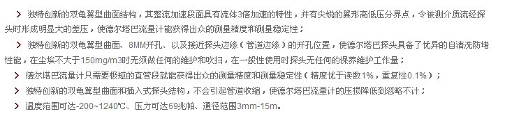 通常为洁净水,管径一般不大,但是压力比较大,温度为中温以下,是比较合适使用德尔塔巴流量计。锅炉主给水:φ300mm, 300℃,27.4Mpa,1000t/h左右一级二级减温水:口径比较小,φ30mm,,215℃,14Mpa,12th左右再热的事故减温水:φ100mm, 185℃,12Mpa,60lth左右连排排污水:φ80mm,360℃,18.95Mpa,16t/h左右给水泵出口流量:φ76mm, 175℃,10.5Mpa,30t/h左右