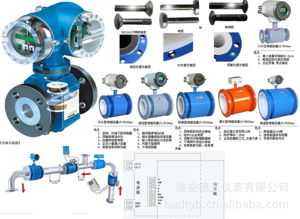 1 概述 工作原理 电流量计测量原理是基于法拉第电磁感应定律。流量计的测量管是一内衬绝缘材料的非导磁合金短管。两只电极沿管径方向穿通管壁固定在测量管上。其电极头与衬里内表面基本齐平。励磁线圈由双方波脉冲励磁时,将在与测量管轴线垂直的方向上产生一磁通量密度为B的工作磁场。此时,如果具有一定电导率的流体流经测量管。将切割磁力线感应出电动势E。电动势E正比于磁通量密度B,测量管内径d与平均流速v的乘积。电动势E(流量信号)由电极检出并通过电缆送至转换器。转化器将流量信号放大处理后,可显示流体流量,并能输出脉冲,模拟电流等信号,用于流量的控制和调节。 E=KBdv 式中:E---------------为电极间的信号电压(v) B-----------------磁通密度(T) d------------------测量管内径(m) v------------------平均流速(m/s) 式中k, d为常数,由于励磁电流是恒流的,故B也是常数,则由E=KBdv可知,体积流量Q与信号电压E-成正比,即流速感应的信号电压E与体积Q成线性关系。因此,只要测量出E就可确定流量Q,这是电磁流量计的基本工作原理。 由E=KBdv可知,被测流量体介质的温度、密度、压力、电导率、液固两两相流体介质的液固成分比等参数不会影响测量结果。至于流动状态只要符合轴对称流动(如层流或者动及阻流部件,因此几乎没有压力损失,并且有分高的可靠性。 应用领域 由于电磁流量计有其独特的优点,因此被广泛用于化工化纤、食品、造纸、制糖、矿冶、给排水、环保、水利水工、钢铁、石油、制药等工业领域中,用来测量各种酸、碱、盐溶液、泥浆、矿浆、纸浆、煤水浆、玉米浆、纤维浆、粮浆、石灰乳、污水、冷却原水、给排水、盐水、双氧水、啤酒、麦汁、各种饮料、黑液、绿液等导电液体介质的体积流量 2主要技术参数 ●公称通径系列DN(mm) 管道式四氟衬里: 10,15,20,25,32,40,50,65,80,100,125 150,200,250,300,350,400.450,500,600 管道式橡胶衬里: 40,50,65,80,100,125,150,200,300 350,400,500,600,800,1000,1200 注:特殊规格可以定制 ● 流动方向 正,反,净流量, 量程比:150:1 重复性误差:测量值的±0.1% ● 精度等级:管道式:0.5级,1.0级 ● 被测介质温度: 普通橡胶衬里:-20~+60℃ 高温橡胶衬里:-20~+90℃ 聚四氟乙烯衬里:-30~+100℃ 高温型乙烯衬里:-30~+180℃ ● 额定工作压力: 管道式:DN10—DN65:≤2.5Mpa, DN80—DN150:≤1.6Mpa, DN200—DN1200:≤1.0Mpa ● 流量测量范围: 流量测量范围对流速度范围是0.3—15m/s | ● 电导率范围: 被测流体电导率≥5μs/cm 大多数以水为成份的介质,其导电率在200-800μs/cm范围内,均可选用电磁流量; ● 输出电流及负载电阻: 4~20mA全隔离负载电阻<750欧姆脉冲频率0-1KHZ光电隔离OCT外接电源≤35V 导通时 集电极最大电流为25mA ● 电极材料: 含钼不锈刚、钛(Ti)、钽(Ta)、哈氏合金(H)、铂(Pt)或其他特殊电极材料 ● 防护等级: 潜水型: IP68,其他型 IP65 ● 供电电源: 85~265V, 45~63HZ ● 直管段长度: 管道式:上游≥5DN,下游≥2DN ● 连接方式: 流量计与配管之间均采用法兰连接,法兰连接尺寸应符合GB9119-88的规定。 ● 防暴标志:mdllBT4 ● 环境温度: -25℃~+60℃ ● 相对温度:5%~95% ● 消耗总功率:小于20W |