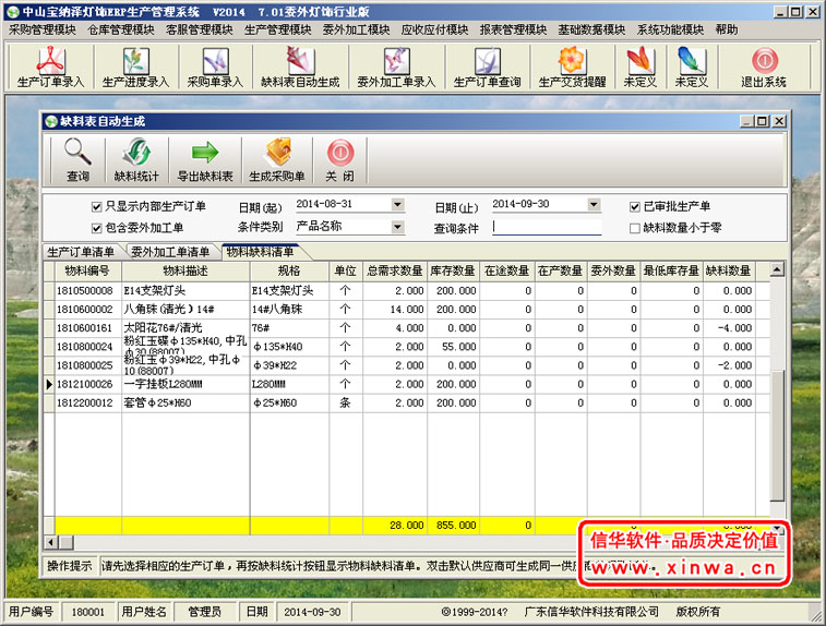 ④软件设有“缺料表自动生成功能”,可综合未完成订单需求数量、在途库存、委外库存、在产库存、实有库存和***低库存数量等数据进行MRP运算,求出多张生产订单综合起来材料的缺料数量。缺料表自动生成功能可把缺料情况导出到excel,也可以自动生成采购单,能大大提高PMC和采购的工作效率,并能切实保障每张生产订单都能足料生产。