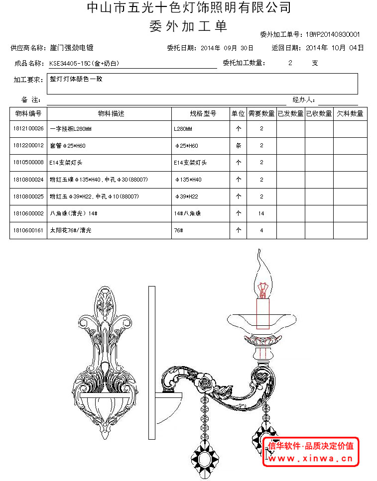 ⑤软件设有专门的委外模块,可录入委外加工单,包括工艺加工要求、加工数量、加工单价、交货日期等相关信息,通过专门的委外加工统计表,即可很容易跟进到每张委外单发出哪些材料,回来了多少加工的成品,一清二楚。