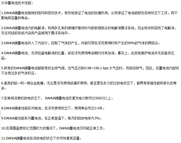 采用了内阻值很小的优质极板和玻纤隔板,而且装配较紧,使得电池内阻***。在-40℃~60℃温度范围内进行大电流放电,其输出功率比常规电池可高出15%左右。