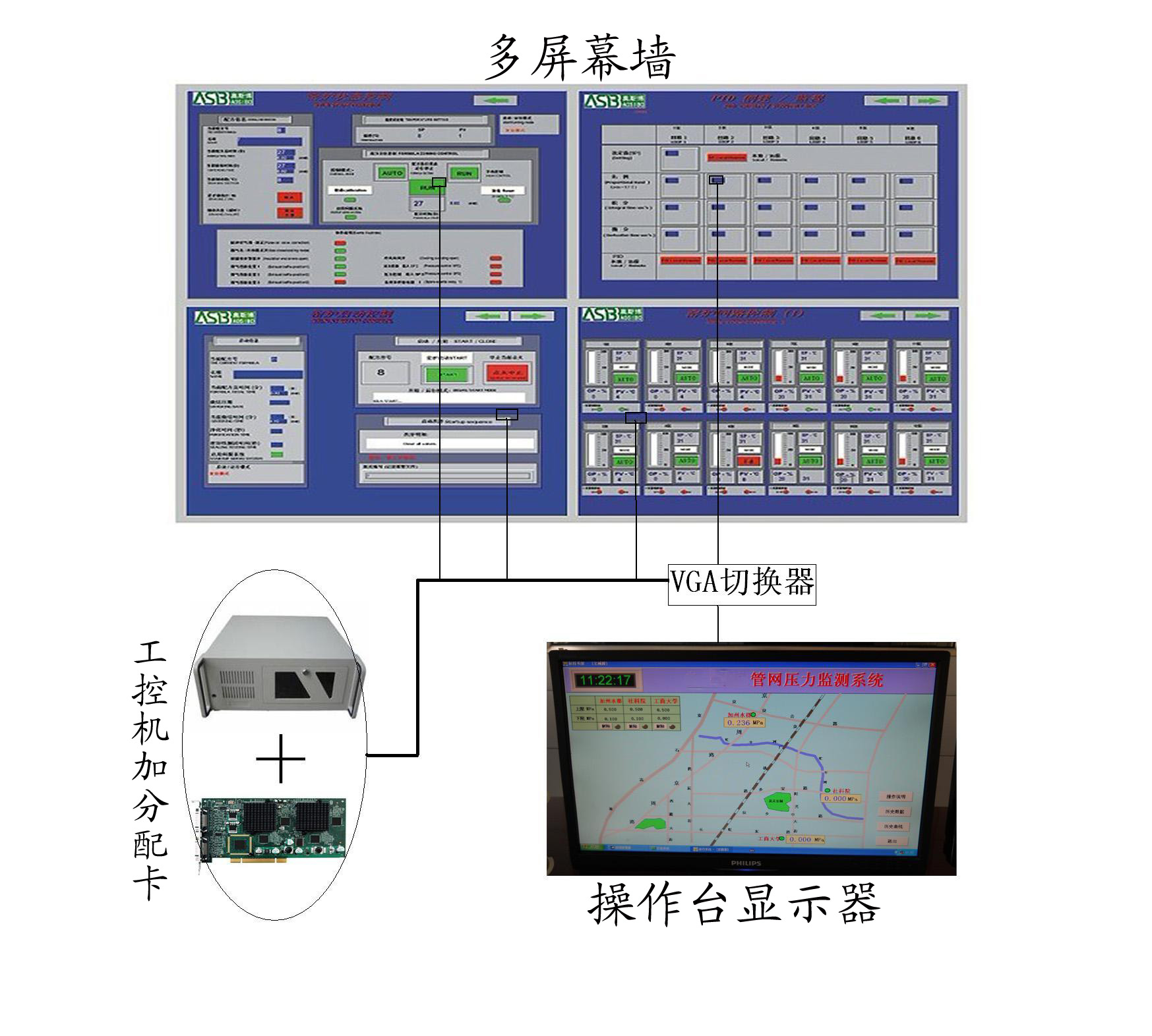 工控机加NVS400后,分出4条VGA线,分别接4块工控显示屏,把其中一条VGA线可以设置为主屏,为该主屏线加VGA切换器可以多分给操作台一台小显示器,该小显示器可以同步工控显示屏。