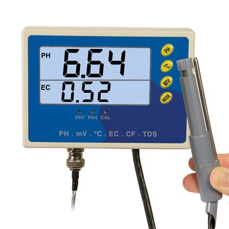 该phh-128指标结合5米到一个易于使用的墙壁安装连续监测,具有很大,duallevel,背光液晶显示屏。该表可以显示EC、TDS / CF(导热系数)你的解决方案结合的pH值的选择(探头单独出售),或氧化还原电位(ORP)(探头单独出售)和温度。
