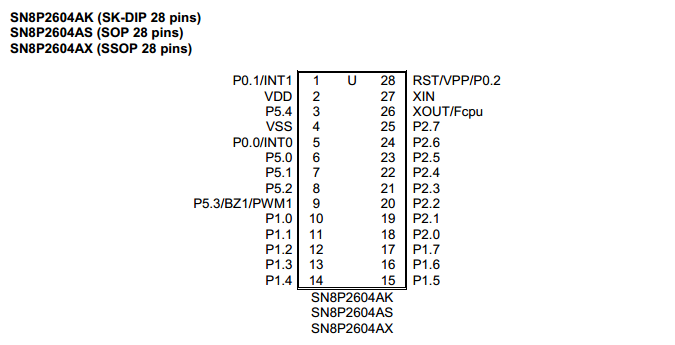 SN8P2604A 8位微控制器具有高性能,低功耗的特點.指令執行時間為1個時鐘震盪週期的結構使工作速度可達16MIPS。高EFT能力使SN8P2604A適合在高干擾環境下工作。SN8P2604A的IC結構設計***,包括一個大容量(4K-word)的程式記憶體(OTP ROM),128-byte的資料記憶體(RAM), 兩個8位定時/計數器(T0.TC1),一個看門狗計時器,四個中斷源(T0, TC1, INT0, INT1),以及8層堆疊緩存區。此外,用戶可自行選擇晶片的振盪形式,有四種不同的外部振盪結構提供給系統作為時鐘源:高/低速晶體振盪器/陶瓷諧振器和RC振盪器等。SN8P2604A還可以通過程式設定內部RC振盪器作為低速模式時鐘源。