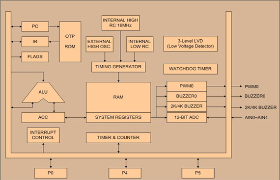 8位单片机SN8P2722A带有RISC-like系统,具有高性能、低功耗的特点。SN8P2722A的IC结构***,包括2K-word的程序内存(OTP ROM),128-byte的数据存储器(RAM),2个8位定时计数器(T0,TC0),一个看门狗定时器,4个中断源(T0,TC0, ADC,INT0),1通道8位PWM(PWM0),1通道Buzzer输出(2K/4K),5信道12位ADC,8层堆栈缓存器。此外,用户还可以自行选择振荡模式,SN8P2722A提供了4种不同的振荡模式给系统作为系统时钟,包括外部高/低速晶体振荡器、陶瓷谐振器和内部廉价的RC振荡器。另外,SN8P2722A还包括一个内部16MHz RC振荡器作为系统时钟和一个低频RC振荡器在低速模式下使用(由程序控制)