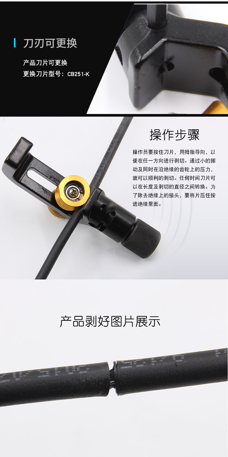 • 一次性操作即可开剥聚乙烯外护套和铠装层