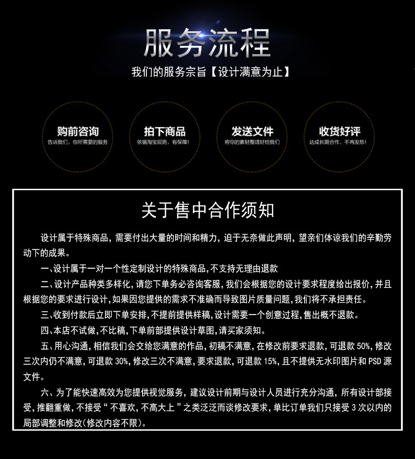 退款流程:初稿不满意,在修改前要求退款,可退款70%,修改三次内仍不满意,可退款50%,修改三次不满意,要求退款,可退款15%。