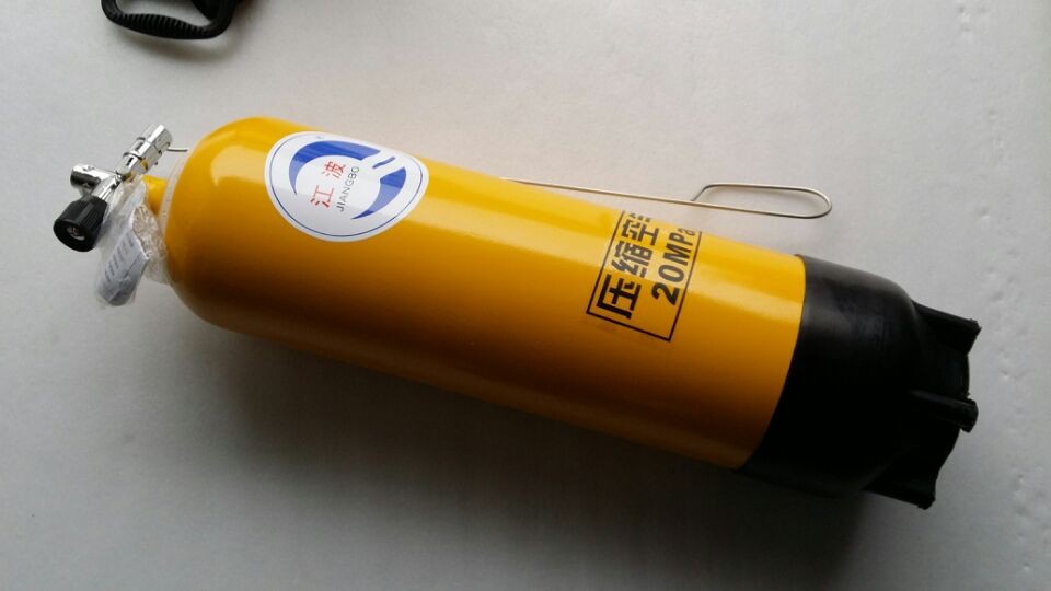 潜水气瓶主要用于潜水装具配备,潜水钢瓶容积为12L,气瓶工作压力为20MPa,气瓶总成配有瓶头信号阀和橡胶瓶座。