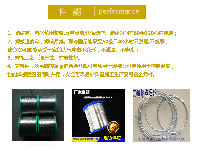 3.用于电气、电子产品安全装置温感元件的105℃、110℃、115℃、120℃、125℃、130℃、135℃、140℃、145℃、150℃易熔合金;