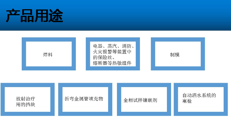 易熔合金常被广泛地用做焊料,以及电器、蒸汽、消防、火灾报警等装置中的***丝、熔断器等热敏组件,是一类颇具发展潜力的低熔点合金新型材料。一般铋锡低熔点合金熔点只有70~160℃,加热熔化后具有良好的流动性,所以该类低熔点金属也被广泛用来采用铸造的方法制模,易熔合金用在制模中,制模周期短,机加工工时少,优越性明显。此外易熔金属还被广泛应用在***上制作******用的挡块, 用低熔点合金制作的挡块在******时能有效地遮挡***正常***,易熔合金制作挡块的方法有效提高了******的***度与安全度。