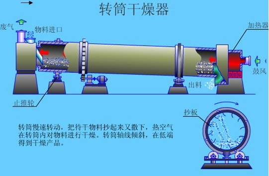 烘干机有带式烘干,滚筒烘干,箱式烘干,塔式烘干等几种模式;热源有煤,电,气等;物料在烘干过程中有热风气流式和辐射式等,热风滚筒烘干是热气流从尾部向前运动,与物料充分接触,通过热传导、对流、辐射传热量充分利用;将热能直接传递给物料,使物料的水分在筒体内不断被蒸发,入料口的引风装置将大量的水分、湿气流抽出,防止粉尘外排造成的二次污染;通过内螺旋搅拌、扫散、抄板,推进物料运动,完成整个烘干过程;逆流传导脱湿,避免减少重复烘干程序。