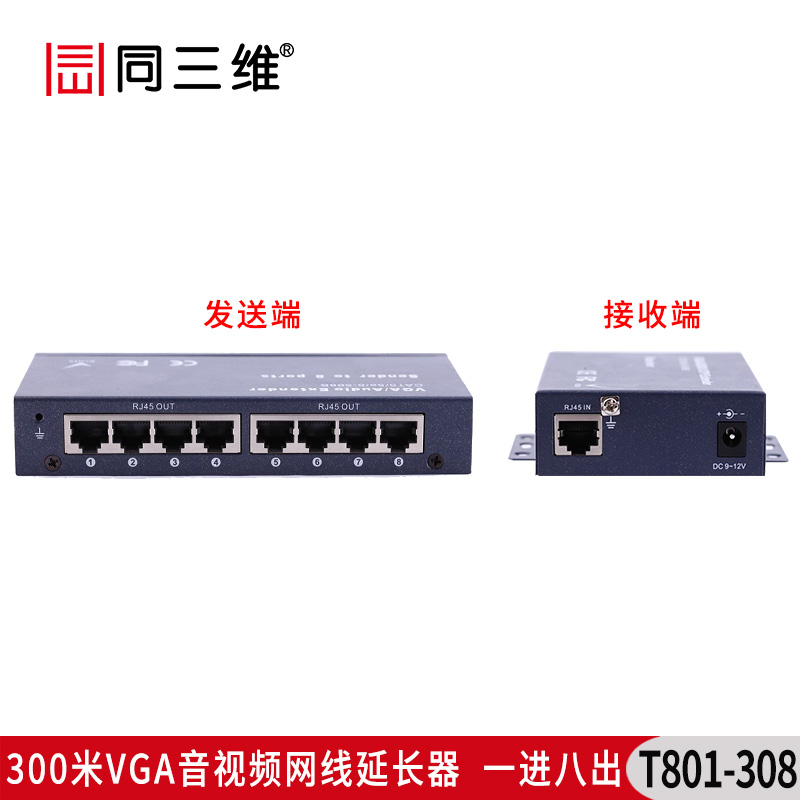 同三维T801-308传输器是一款可以将VGA信号传输300米并且一分八输出的音视频信号延长器,其发射端将一路VGA信号和音频输入并转换为8路***RJ45双绞线传至远处接收端,再由8个接收端转换成8路VGA信号和音频,并且每路信号相对***互不干扰,***远可以传输300米。