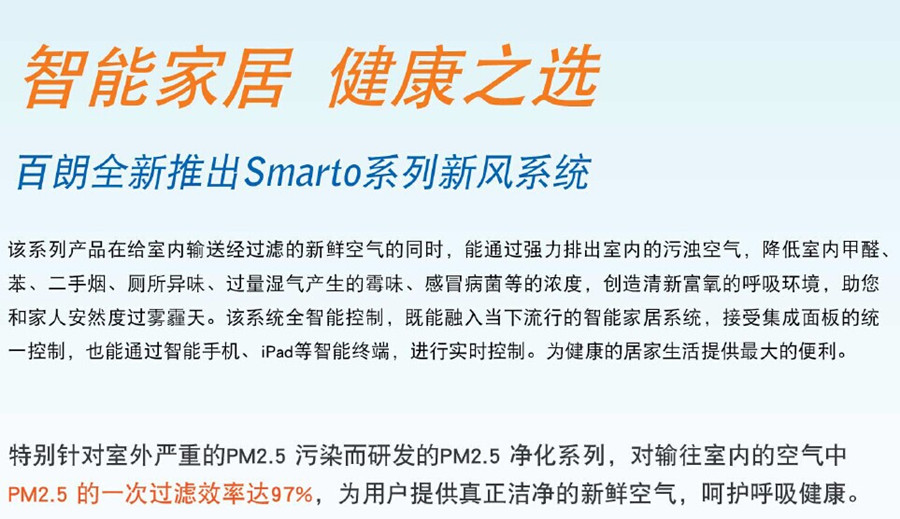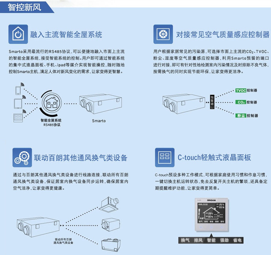 - 智控新风:***arto系列新风系统可融入主流智能全屋系统,对接常见空气质量感应控制器,联动百朗其他通风换气类设备,配C-touch轻触式液晶面板,让家变得更简单、智慧、洁净、健康